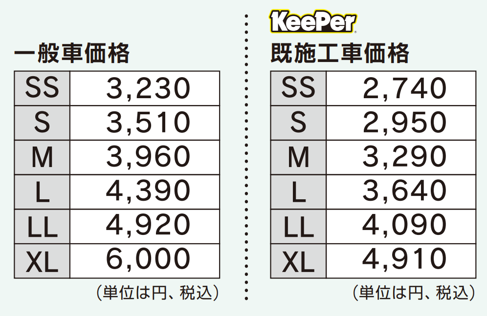 また、当店の手洗い洗車受付時に施工証明書のご提示で洗車料金が「キーパー施工車価格」となります。