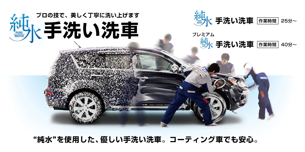 逆浸透圧(膜)の原理」で、 水道水の中に溶け込んでいるナトリウムやマグネシウムなどをほぼ完全に除去したピュアな水のことです。 水道水がボディ上で乾くと、水玉のカタチにミネラルが残り、「水シミ」を発生させます。純水では「水シミ」の原因となるミネラルを除去しているので、洗車後こうしたシミの原因を残しません。