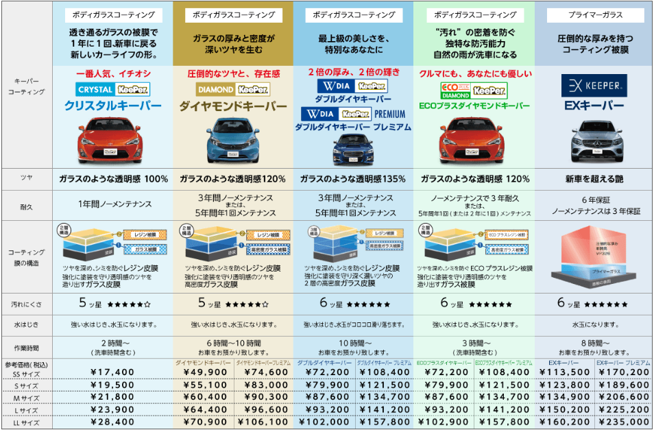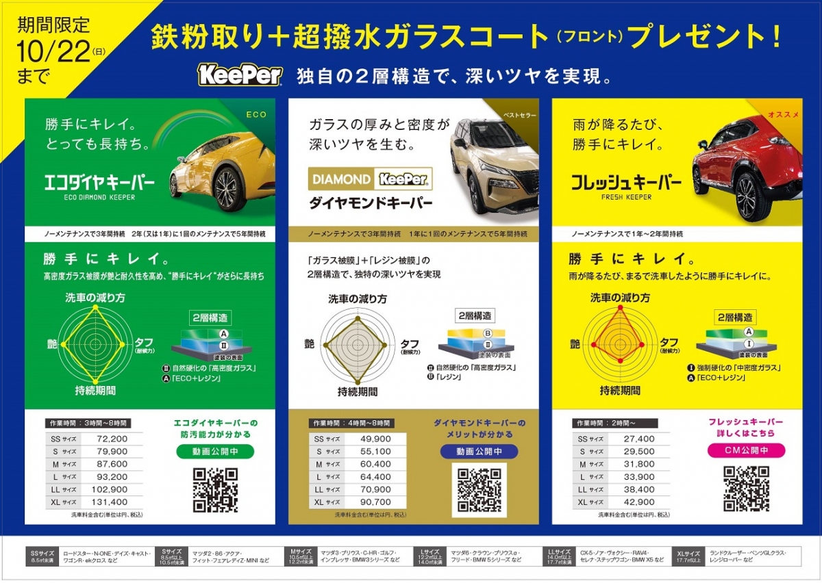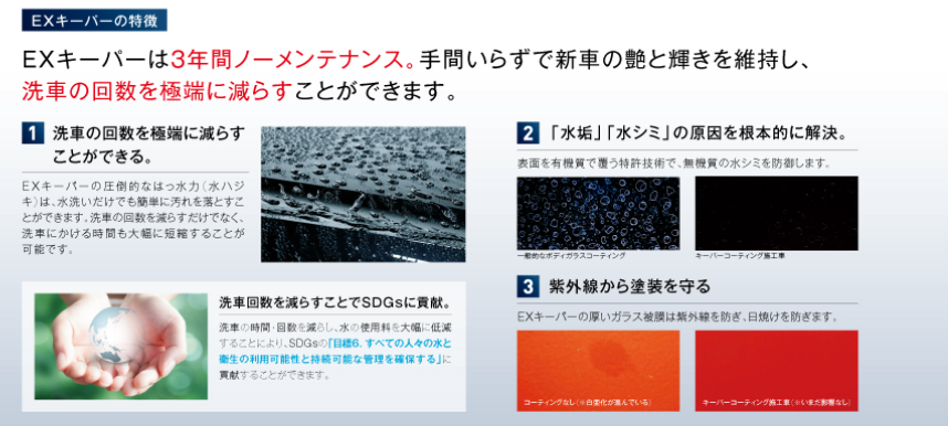 当店でのコーティング施工特典(ピュアキーパーを除く)として ◎1年間ガソリン・軽油3円引き ◎年3回のコーティング点検無料洗車(機械洗車+ミネラル取り)で、1年間オトク♪ (手洗いの場合¥1650別途) さらに、各種コーティング施工証明書も発行しています。万が一、事故にあった場合でも保険対応で再施工できますので安心です。