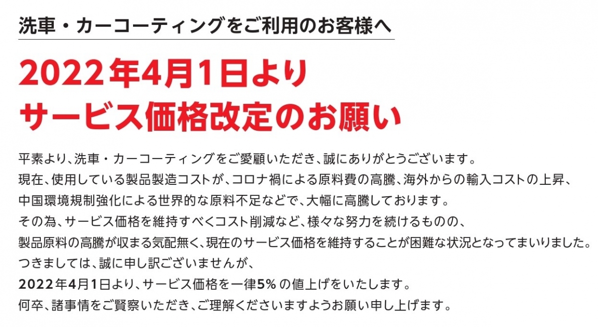 のコーティング施工(手洗い洗車、オプションメニュー施工含む)は誠に勝手ながら休止とさせていただきます。