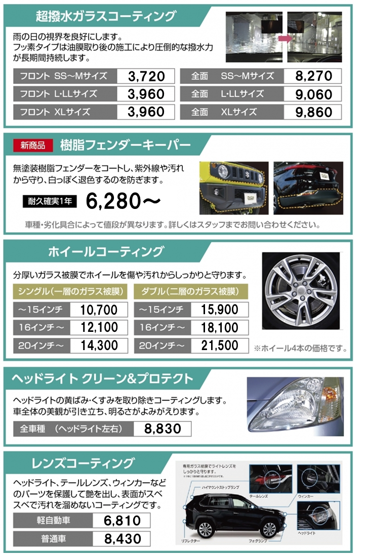 ボディ以外の窓ガラス・ホイール・レンズ・車内まで豊富なラインナップでおクルマをキレイに致します!!!