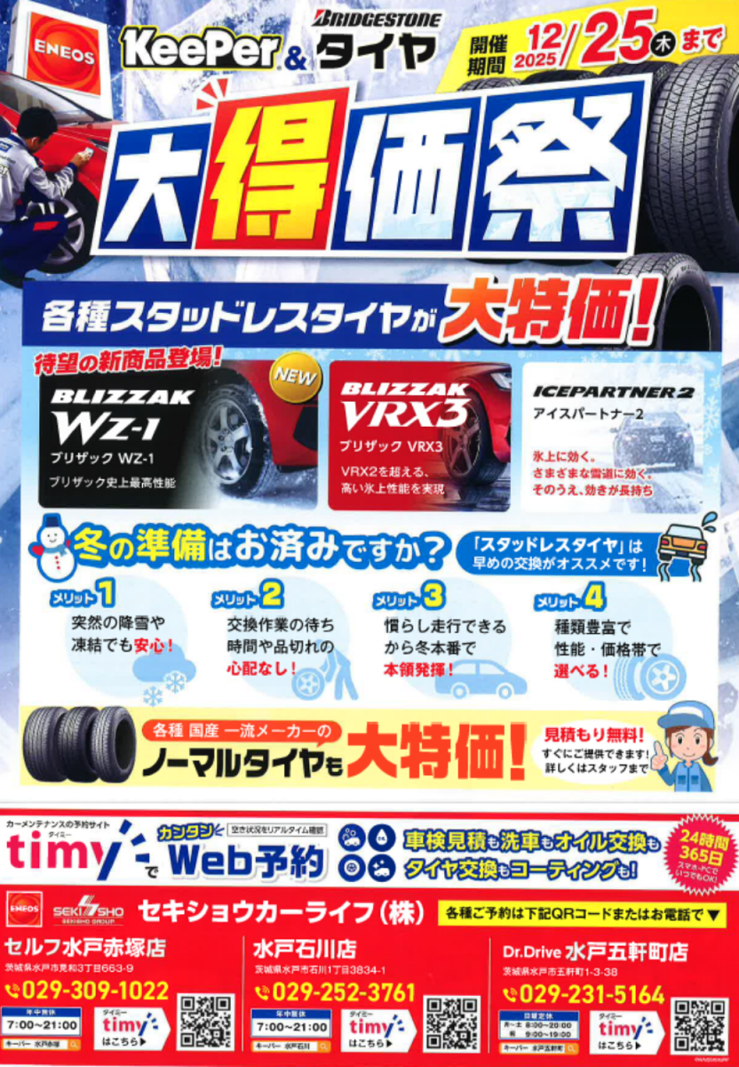 12月25日(木)まで夏・冬タイヤの大特価祭、コーティング20%OFF、タイミー予約によるタイヤ履き替え300円引きも開催中です❗ENEOSアプリからもタイミー予約が可能です。