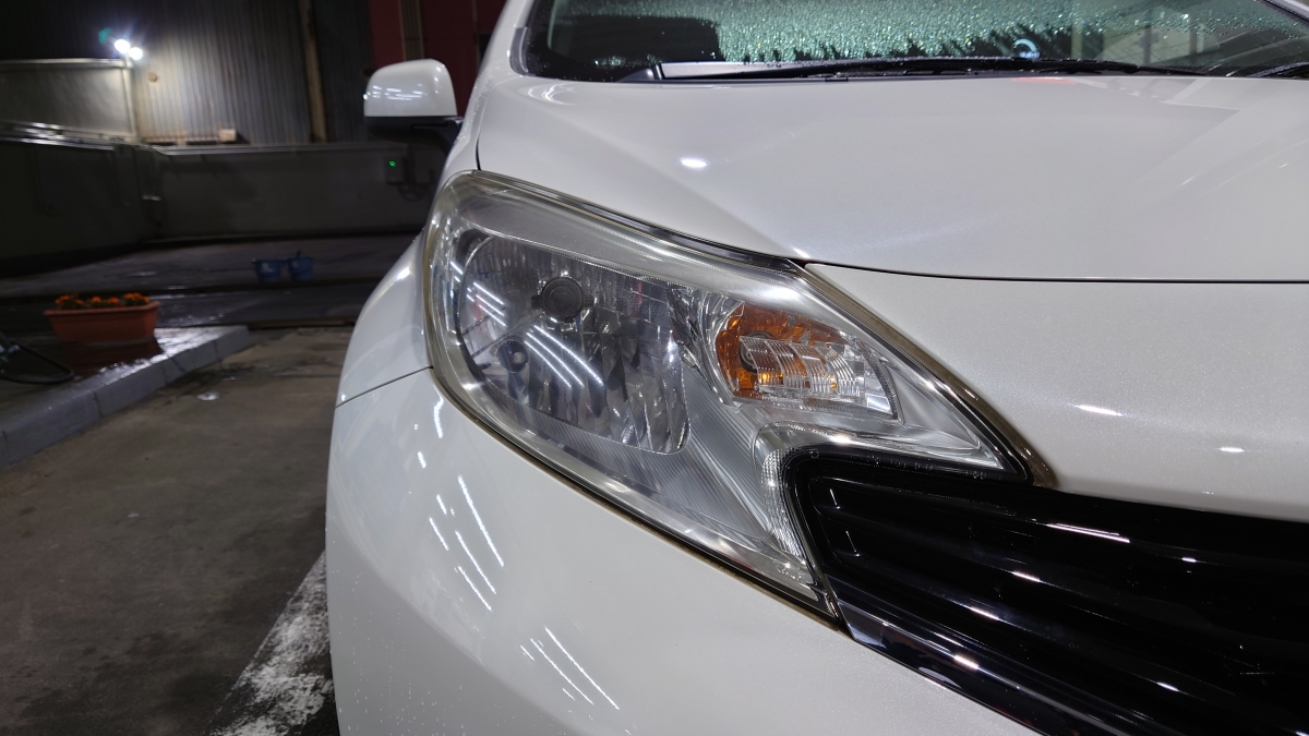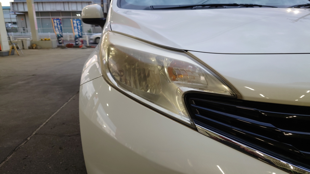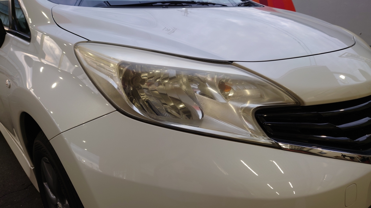 新 車からある程度の年月が経つと、 ヘッドライトの透明カバーの表面が白く濁ったり、黄ばんだりします。 これはポリカーボネイト製のカバー表面に塗ってある水性ハードコートが、 紫外線や熱で劣化したものです。 劣化したハードコートをキレイに取り去って、 無機質の強いガラスコートに入れ替えて透明度の高い新品の状態に戻します。 市販品のようにまたすぐ白く濁ったり、黄ばみが戻ってしまうことがありません。 少なくとも三年は透明状態が確保できます。