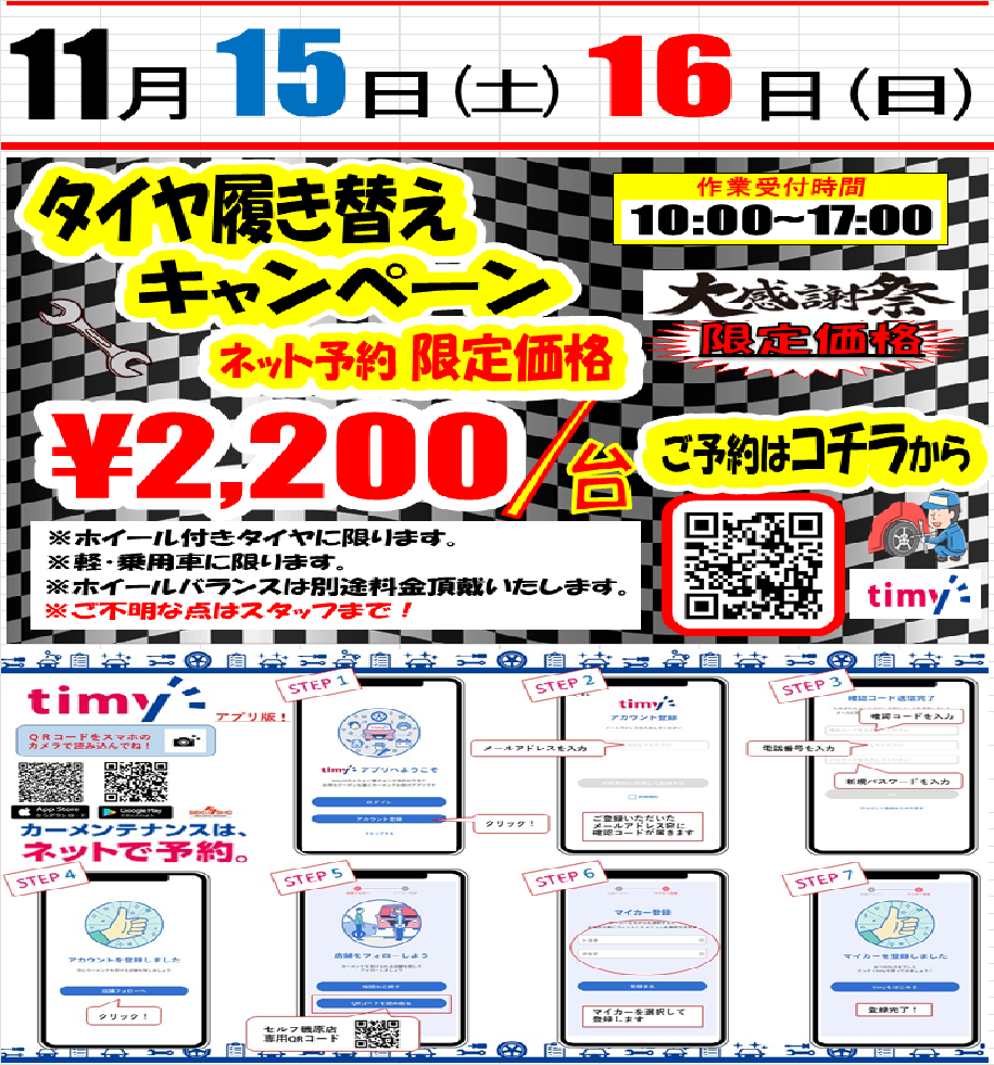 時期的に少し早いですが、タイヤ交換が混みあう前にお得にタイヤ履き替えができますので、この機会にご予約を!! ご予約は下のオレンジ色のtimyバナーをタップ👇