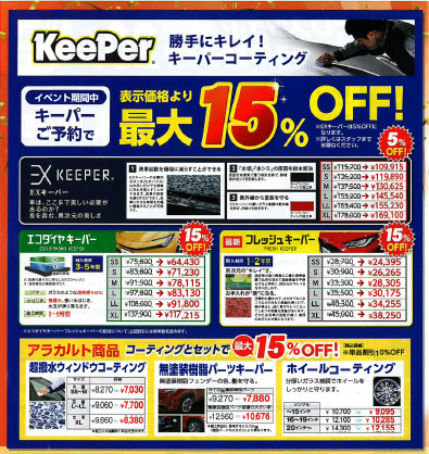 また、キーパーコーティングの方もイベント期間中のご予約で最大15%OFFにて施工できます!ぜひ年末に向けてのこの機会にご予約を。