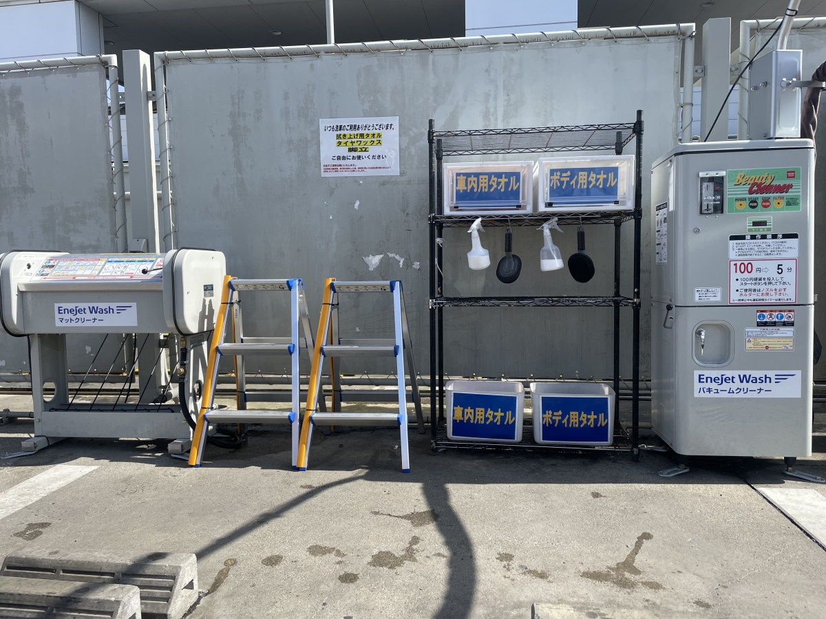 さらに拭き上げ場には,「ボディ用 車内用タオル」「タイヤワックス」「マット洗い機」「脚立」「コイン掃除機(5分/100円)」の貸出をご用意しているので,手ぶらでご来店いただいてもOK‼ 店内には自動販売機もありますので,ぜひ店内でご休憩しながら愛車の洗車をお楽しみ下さい‼