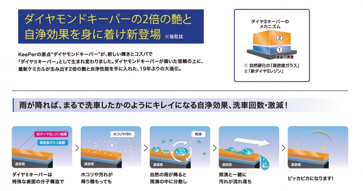「ダイヤⅡキーパー」として生まれ変わりました。ダイヤモンドキーパーが築いた信頼の上に、最新ケミカルが生み出す2倍の艶と自浄性能を手に入れた、19年ぶりの大進化。