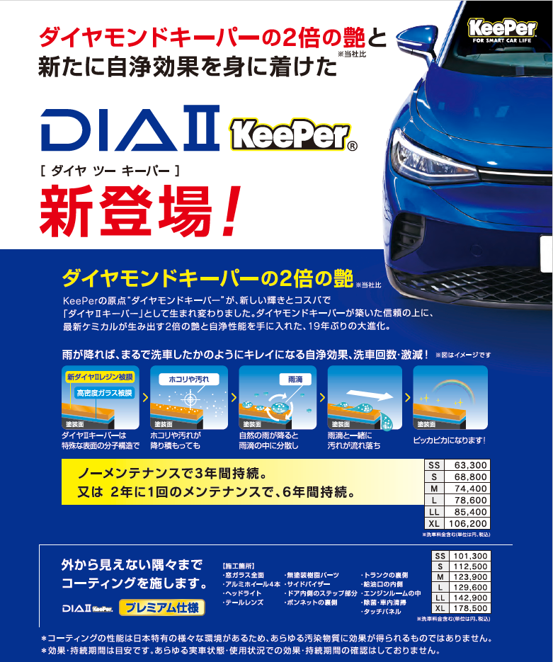 ダイヤⅡキーパーは、ダイヤモンドキーパーの2倍の艶と新たなに自浄効果を持って進化したコーティングです!