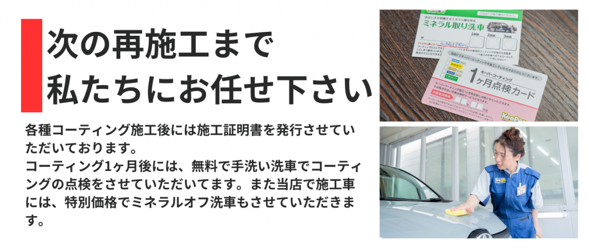 コーティングの上に水弾きを阻害するミネラル成分が付着している可能性がございます。当店ではコーティングのアフターフォローとして、ミネラル除去サービスも行っておりますので、一度ご相談下さい。
