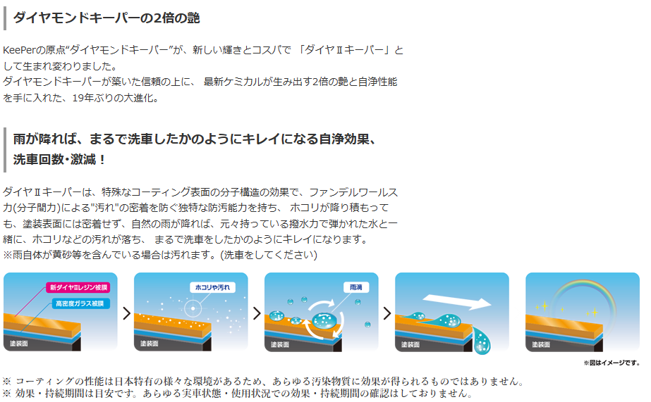 KeePerの原点“ダイヤモンドキーパー”が、新しい輝きとコスパで 「ダイヤⅡキーパー」として生まれ変わりました。 ダイヤモンドキーパーが築いた信頼の上に、 最新ケミカルが生み出す2倍の艶と自浄性能を手に入れた、19年ぶりの大進化!