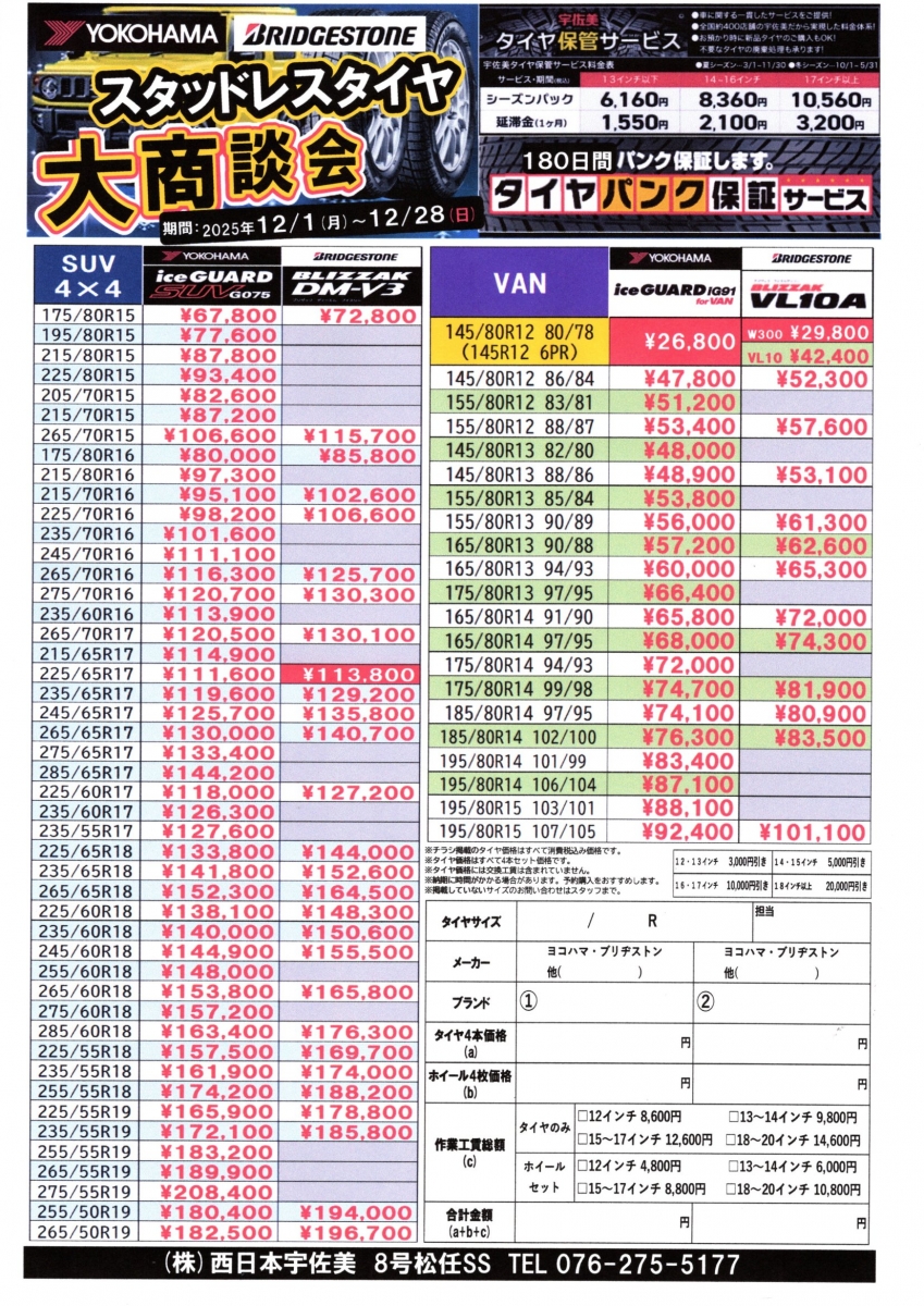 15.16.17インチ 通常価格 4,800円/台(税込)⇒2,500円/(税込)