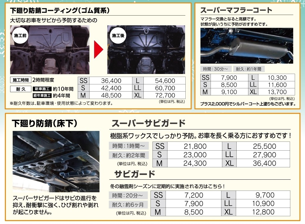 岩手の冬には欠かせない、アンダーコーティングを各種ご準備しております!融雪剤や汚れからしっかりと守ることが出来ます!大切な愛車の下回り対策は是非当店にお任せください!