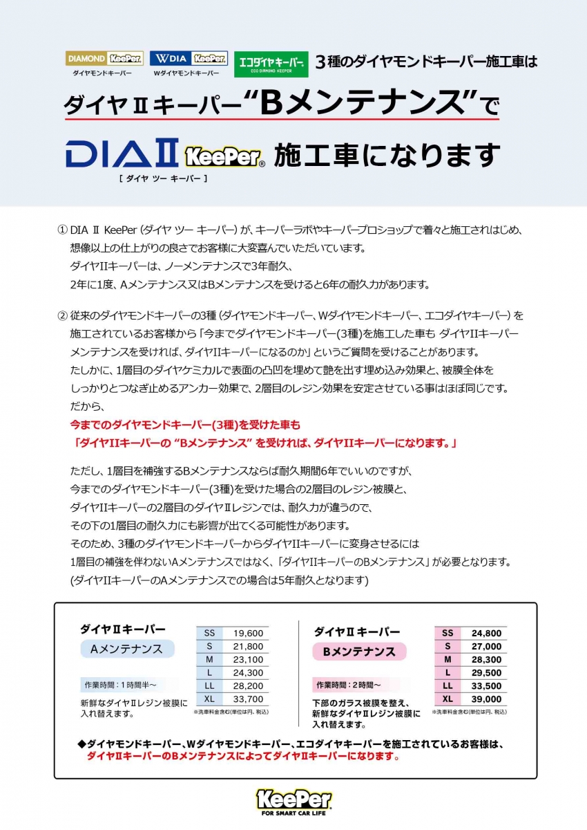 いつも閲覧ありがとうございます!カメイ㈱セルフ富士見店です(^_^)エコダイヤモンドキーパーのメンテナンスで、ご予約頂いたお客様のお車をダイヤⅡキーパーのBメンテナンスで、ダイヤⅡキーパーに切り替えを...