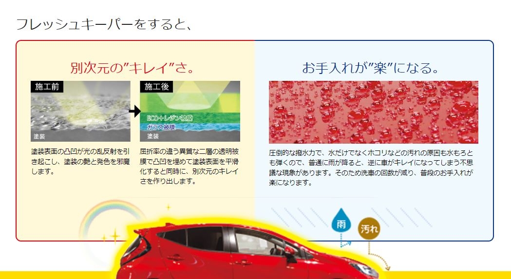 A.コーティングは、納車後すぐのタイミングがお勧めです。 キーパーコーティングは、非常に細かい分子でコーティングを定着させていきます。 例えば、塗りたての塗装でも、通気性に優れておりますので塗装の乾燥過程に出てくるガスも コーティングした後でもキレイに抜けていきます。 多くのガラスコーティングに入っているキシレンなどの『有機溶剤』を使わないため 塗装に優しく、侵食してしまうことはありませんのでご安心してお任せ下さい。