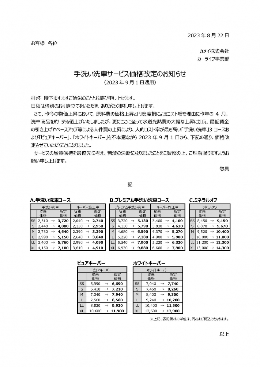 *キーパー施工車は、施工されていない一般車と比べ、汚れが簡単に落とせて大変洗いやすいため、価格がお安くなっております。受付時、施工証明書をご提示ください。他店でキーパー施工のお車もOK!施工証明書をご持参ください。(各キーパーコーティングの施工有効期限内のお車に限ります)