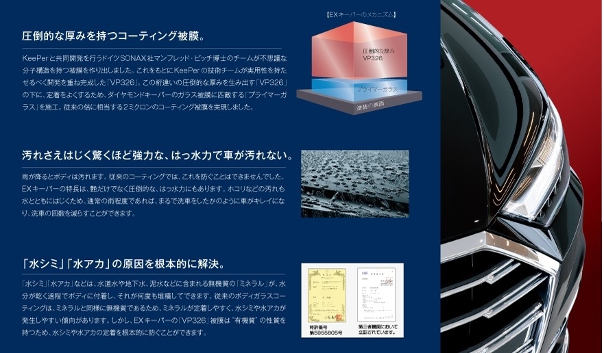 キーパー被膜は塗装の身代わりとなって汚れを受け止め、酸性雨や摩擦などによる「荒れ」の要因を受け止める「犠牲被膜」の性質を持っています。