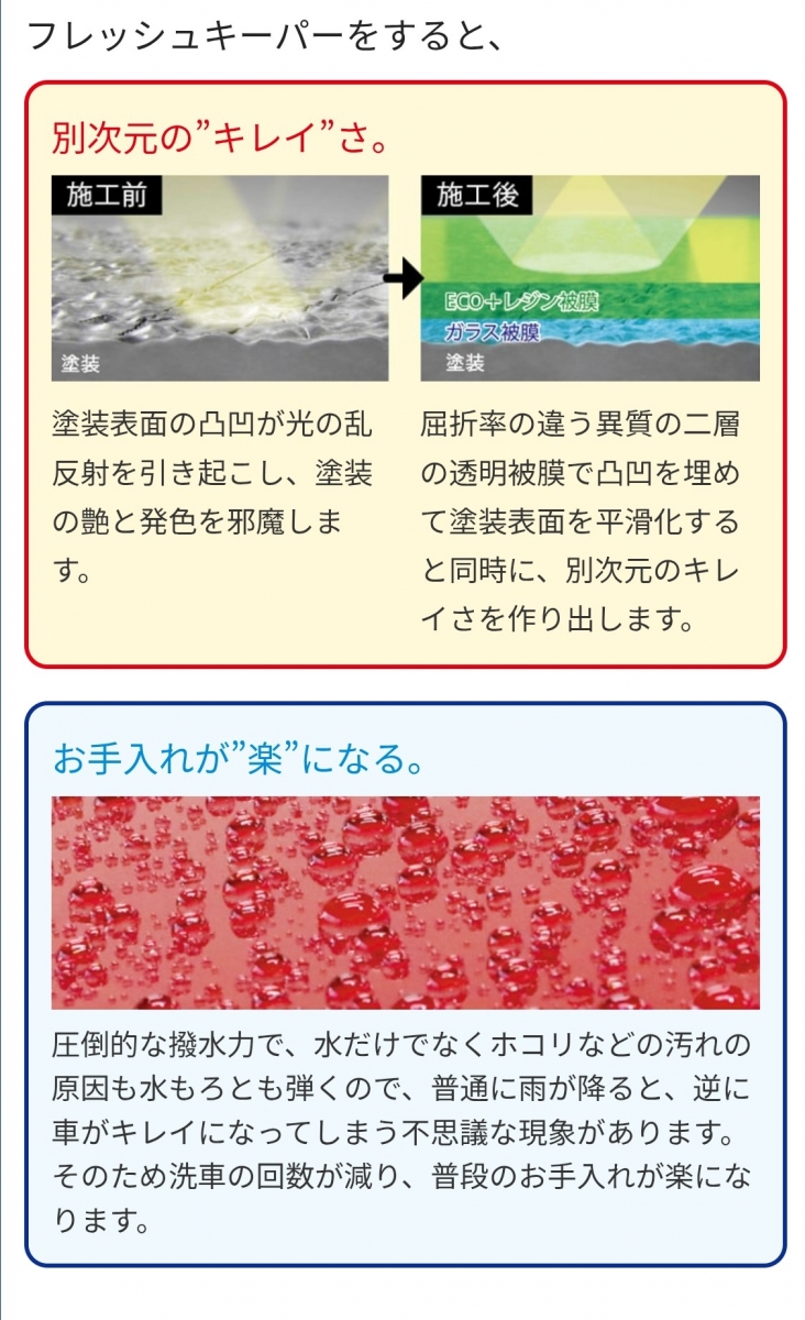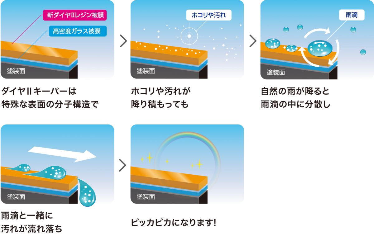 ダイヤIIキーパーは、高密度ガラス被膜をベースに、新開発の有機レジン被膜「新ダイヤIIレジン」を重ねた2層構造。 従来のエコダイヤキーパーの防汚性能はそのままに、 美しく、劇的に性能がアップした新しいボディガラスコーティングです。