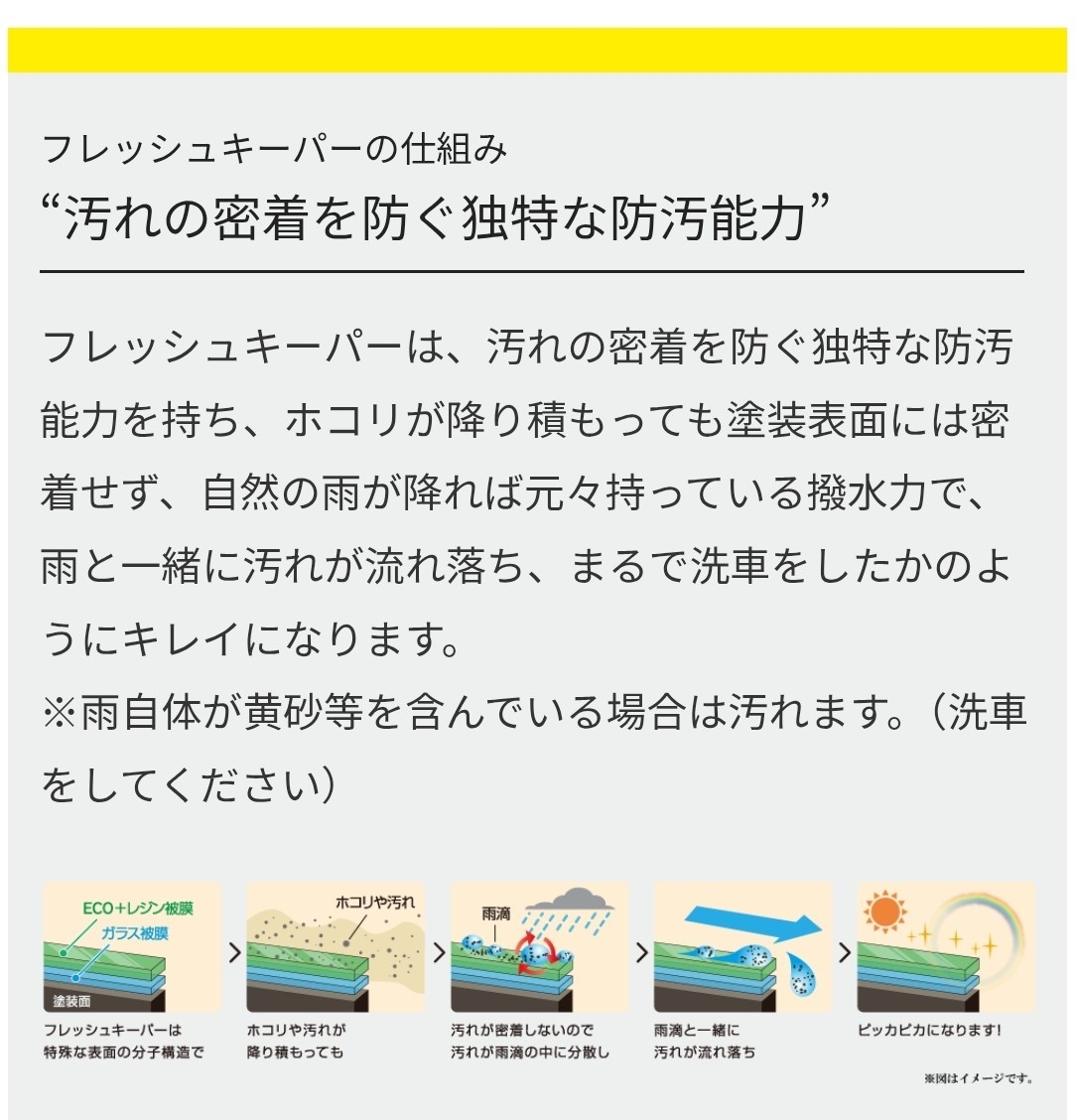 雨が降れば、まるで洗車したかのようにキレイになる自浄効果、洗車回数・激減!