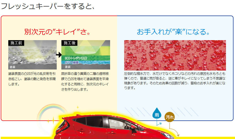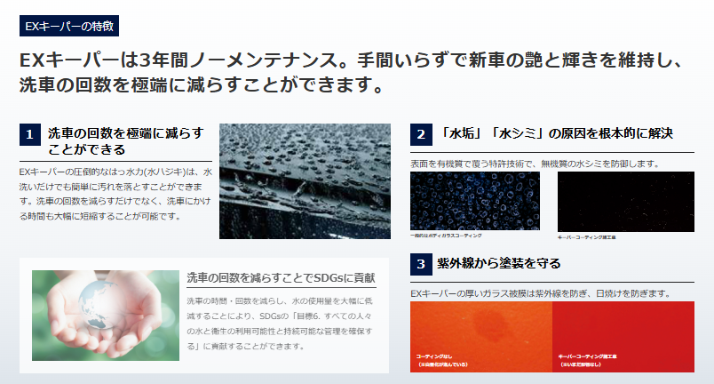半年から1年のメンテナンスで5年間洗車だけ!! または、ノーメンテナンスで3年間洗車だけ!! とんでもない艶がお車を輝かせます✨
