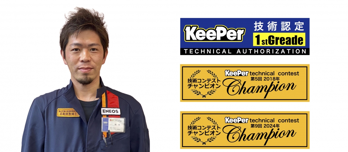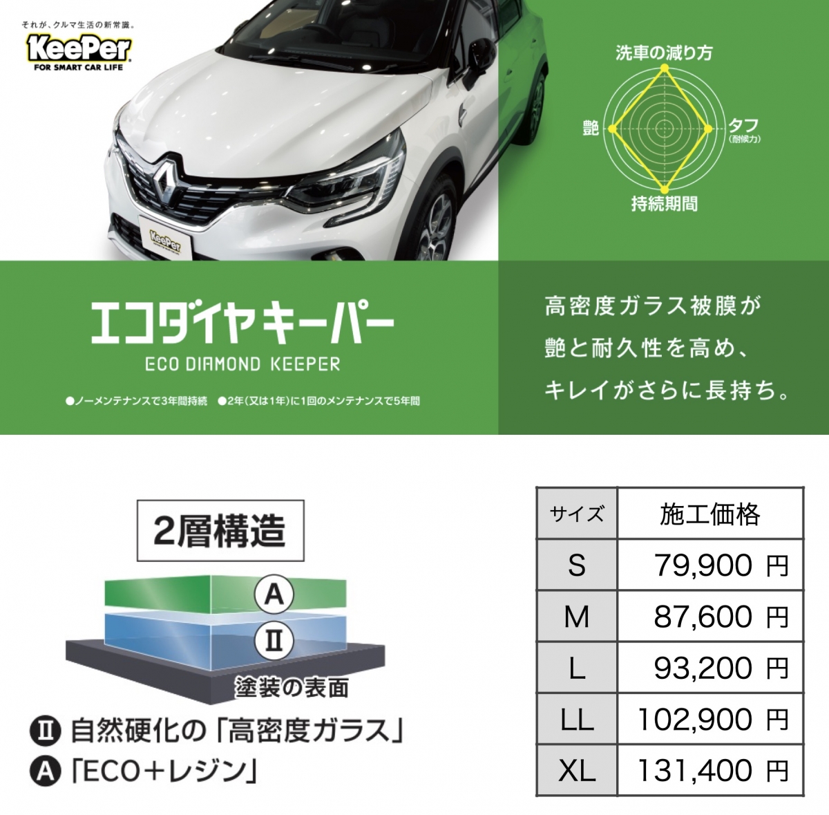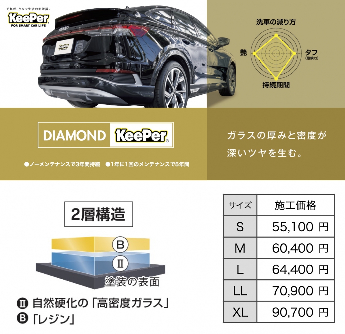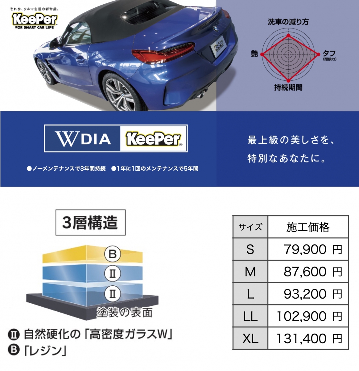 キーパーコーティング施工後、コーティング被膜の定着状態などを確認させていただくために1ヶ月点検を推奨しております。その際、無料で手洗い洗車を行い、状態を確認し、もし万が一不備があった場合は、その部分の手直しや再施工を無料で行っております。 また、各種キーパーコーティングの被膜の持続期間中は、定期的に洗車をお任せいただければ、都度状態を確認し、必要であればコーティングのケアも行っております。 それから、施工証明書を発行しておりますので、万が一の保険事故などにより鈑金修理などを行った場合でも、再施工(部分施工)が保険の適用になる場合がございますので、ご安心してキレイが継続されます。 それなので、施工後のアフターフォローも万全な体制をとっております。 スタッフ紹介 コーティング技術認定資格者 プロの技術を取得したコーティング技術1級資格者または、2級資格者が責任を持ってお客様の愛車に高品質なコーティングを施します。 ゼネラルマネージャー兼 店長 町田 自動車二級整備士 コーティング技術EX一級資格者 ★2025年 キーパー技術コンテスト 神奈川Aチャンピオン決定戦 準優勝 ★2024年 キーパー技術コンテスト 神奈川Aチャンピオン決定戦 優勝 ★2023年 キーパー技術コンテスト 神奈川県チャンピオン決定戦 準優勝 ★2022年 キーパー技術コンテスト 神奈川県チャンピオン決定戦 第3位 ★2018年 キーパー技術コンテスト 神奈川県チャンピオン決定戦 優勝 全日本チャンピオン決定戦 出場 ★2017年 キーパー技術コンテスト 神奈川県チャンピオン決定戦 準優勝 ★2016年 キーパー技術コンテスト 全日本チャンピオン決定戦 出場 ★2016年 キーパー技術コンテスト 地区チャンピオン決定戦 4位入賞 (神奈川 西東京 静岡東部 山梨) スタッフ 市川 コーティング技術EX一級資格者 ★2025年 キーパー技術コンテスト 神奈川Aチャンピオン決定戦 優勝 全日本チャンピオン決定戦 ファイナリスト ★2024年 キーパー技術コンテスト 神奈川Aチャンピオン決定戦 準優勝 ★2023年 キーパー技術コンテスト 神奈川県チャンピオン決定戦 出場 ★2022年 キーパー技術コンテスト 神奈川県チャンピオン決定戦 4位 新車コーティング受付中! 新車納車を控えている方、これから新車をご購入される方で、新車コーティングをご検討されている方はぜひ、一度ご相談くださいませ。 新車登録日より6ヶ月以内のお車で、ボディガラスコーティングを施工していただいた方に10%割引いたします。 当店は、ただコーティングを施工するだけではなく、オーナー様それぞれのお車の使用頻度や環境などを踏まえ、最適なコーティングプランをご提案いたします。また、新車の輝きを長く継続させるためのアフターサポートもしっかり行っておりますのでご安心してお任せください。 はじめに。マイカーのサイズを調べる↓ 当店のサイズ設定はSサイズからとなっております。 キーパーの基本形 ダイヤモンドキーパー 新車時の輝きを凌駕する艶と濃厚な発色。 新車時にはもちろん、経年車にも圧倒的なツヤと存在感で新車のような輝きに。 キレイが長く続く定番ボディガラスコーティング。 ノーメンテナンス、洗車だけで3年耐久 【特徴】 ●汚れに対する耐性が強く、屋外駐車にも安心。 【こんな方におススメ!】 ●普段のお手入れは洗車だけとお考えの方 ●一度しっかりリフレッシュされたい方 【施工時間】 5時間〜10時間 圧倒的な艶。ダブルの威力。 Wダイヤモンドキーパー ダイヤモンドキーパーの2倍の厚み、2倍の輝きで”異次元のツヤ” を作り出し、三層構造のコーティング被膜によりダイヤモンドキーパーを凌駕する美しさを実感できます。 ノーメンテナンス、洗車だけで3年耐久 1年に1回のメンテナンスで5年耐久 カーライフに合わせて二つのプランがお選び頂けます。 【特徴】 ●圧倒的な防汚性能。 ●ガラス被膜だけでも2層構造。レジン被膜と合わせて3層の被膜で強力に守る。 ●輪郭がハッキリするような濃厚な艶と輝き。 ●強烈な水ハジキで、水玉が滑り落ちる。 ●新車時の輝きをしっかりキープ 【こんな方におススメ】 ●普段のお手入れは洗車だけとお考えの方 ●もっともっと輝きを求める方 ●新車でお車を購入された方 【施工時間】 10時間〜 汚れの密着を防ぐ エコダイヤキーパー 雨が降ったらまるで洗車をしたようにキレイになるので、お手入れがラクになる。 ダイヤモンドキーパーの艶と撥水+EXキーパーのような自浄性能 ノーメンテナンス、洗車だけで3年耐久 2年(または1年)に1回のメンテナンスで5年耐久 カーライフに合わせて二つのプランがお選び頂けます。 【特徴】 エコダイヤキーパーは、特殊なコーティング表面の分子構造の効果で、ファンデルワールス力(分子間力)による