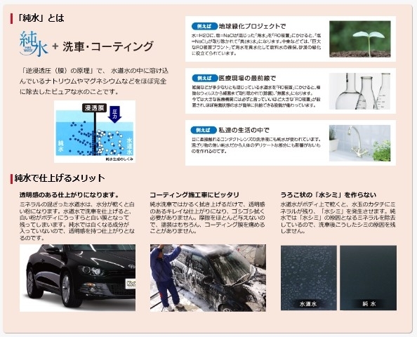 さらに、最後の仕上げで使用する「純水」は、今までの洗車とは別次元のピュアな仕上がりを実現します。
