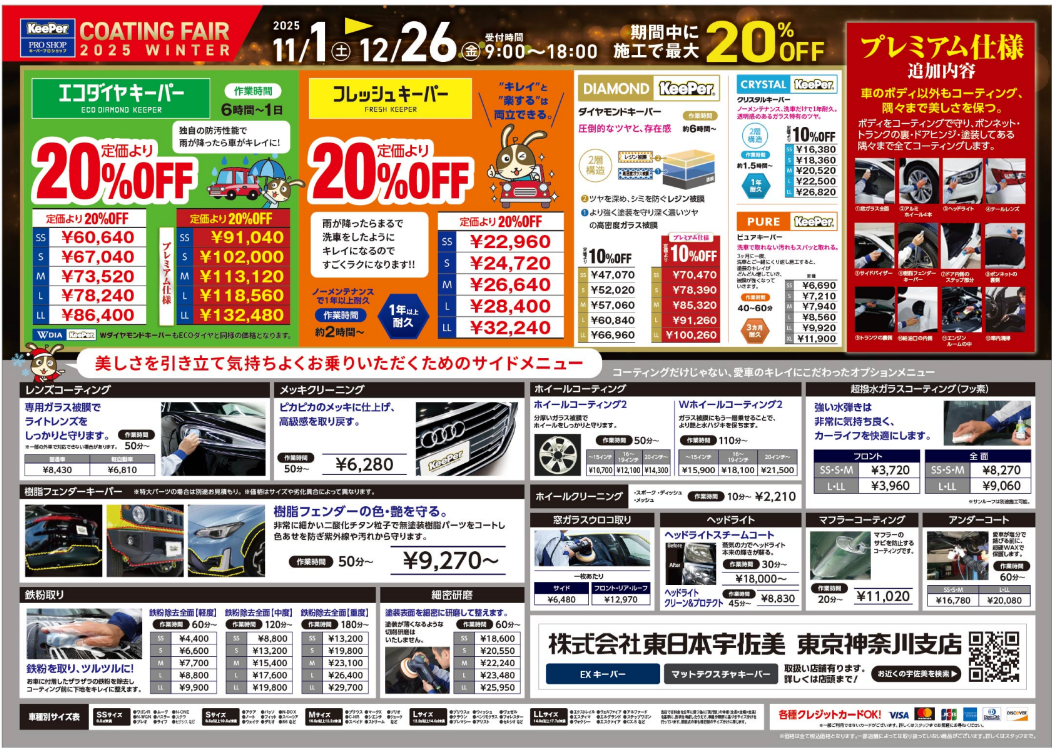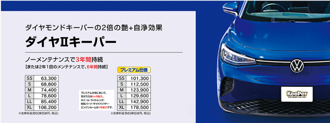 ダイヤⅡコーティングのご予約は、店頭のみの受付とさせていただきます。進化したダイヤモンドキーパーを、いち早く施工したいお客様は、ご検討宜しくお願い致します。さらに、もともとダイヤモンドキーパーを施工されているお客様!必見!メンテナンスでダイヤⅡコーティングのメンテに切り替え可能!さらにメンテナンスが1年から⇒2年に!もともと各種ダイヤモンドキーパー愛用のお車は必見です。