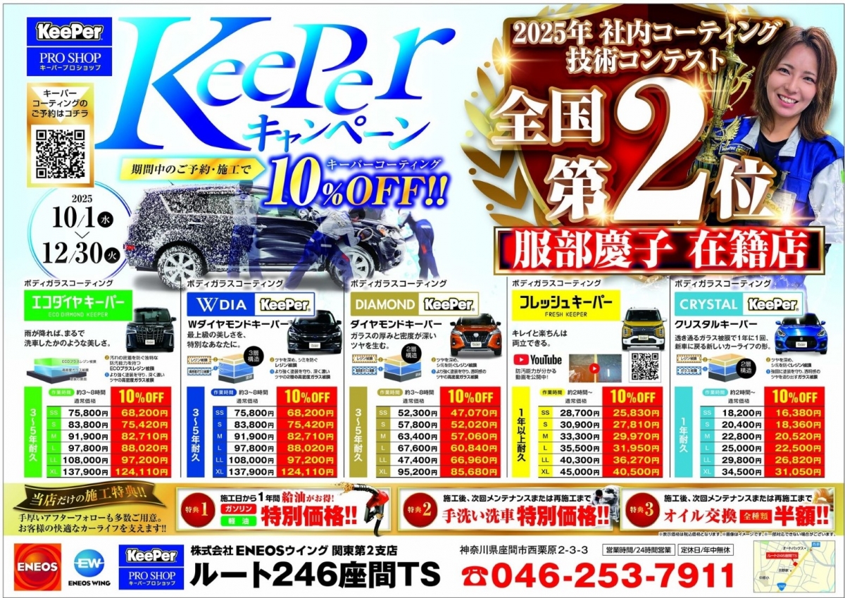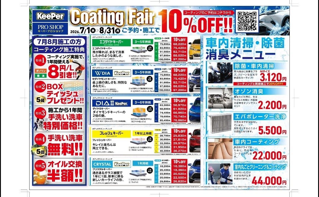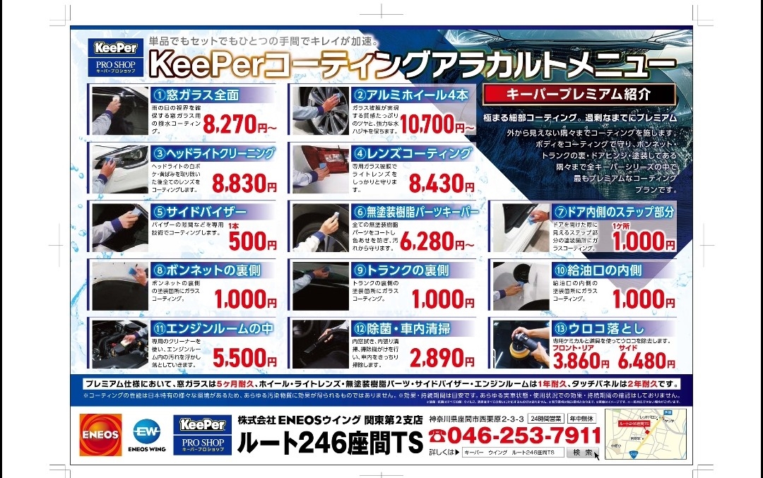 当店では取扱いしてる全ての キーパーコーティングに 施工証明書を発行しています。 コーティングを施工している証明になることはもちろん 万一お車の板金・塗装する際に修理工場へ施工証明書をご提示されると 部分施工等、賠償保険の対象となる場合があります。 また当店では、1年耐久以上のコーティングには ☆年間5回の 手洗い洗車無料券も発行しております!! 当店のコーティングを施工していただくと 1年間手洗い洗車が特別価格で何回でもご利用できます