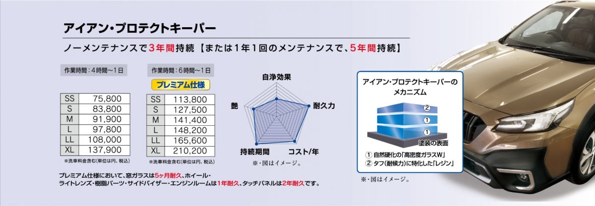 - プレミアム仕様で窓ガラスは5ヶ月耐久、ホイール・ライトレンズ・無塗装樹脂パーツ・サイドバイザー・エンジンルームは1年耐久、タッチパネルは2年耐久