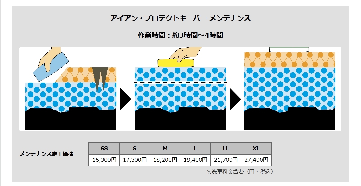 - 3年間ノーメンテナンスで新車の艶と輝きを維持、または2年に1回のメンテナンスで6年間持続
