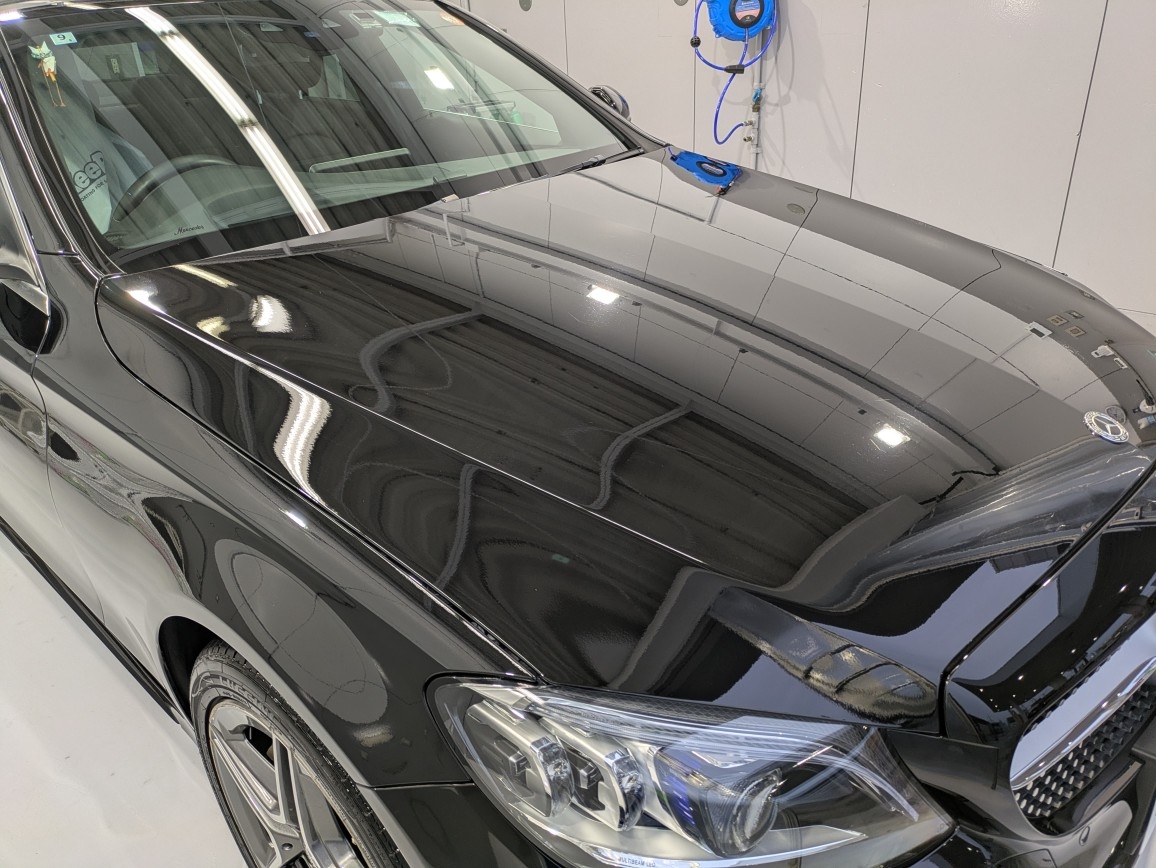 当店は『密閉型コーティング専用ブース』を完備しており、ブース内ではエアコン完備で施工中の水滴や溶剤などの乾燥焼き付きを防ぐため温度調整をおこなっております。洗車・コーティング作業時は水道水ではなくミネラル分を含まない『純水』を使用しており、お車の『キレイ』を一段引き上げる作業を標準化しています。