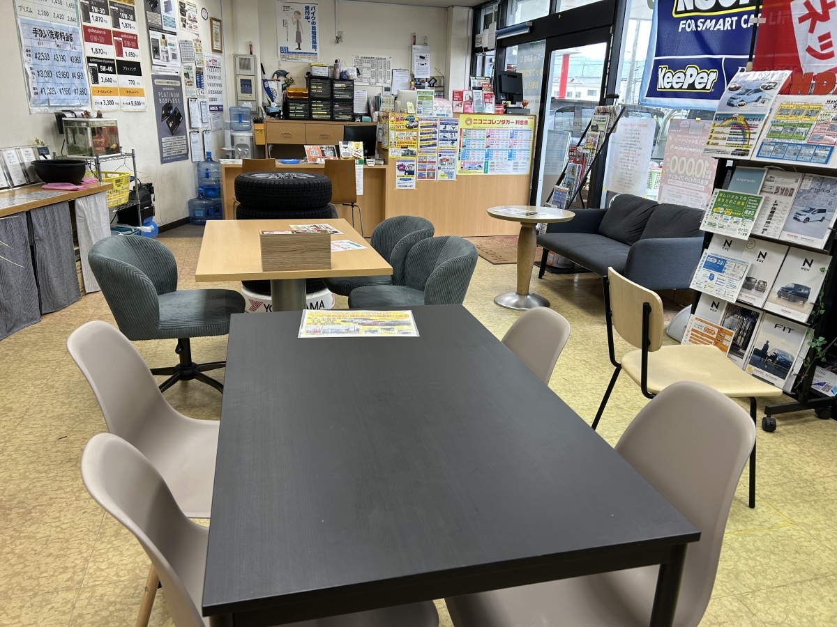 純水手洗い洗車、コーティング施工をお待ちの間、サービスルームにてお待ちいただけます