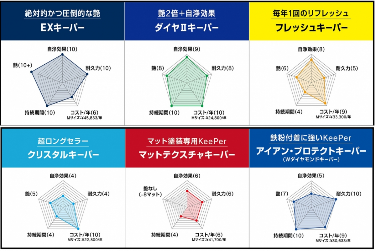 異次元の美しさ「EXキーパー」、ガラス系の「フレッシュキーパー」「クリスタルキーパー」「ダイヤⅡキーパー」「アイアンプロテクトキーパー」5つのコーティングを揃え「従来のダイヤシリーズ」は、お客様のニーズやカーライフに合わせてご提案しています。