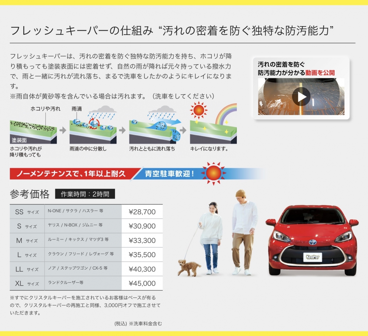 フレッシュキーパーは、汚れの密着を防ぐ独特な防汚能力を持ち、ホコリが降り積もっても塗装表面には密着せず、自然の雨が降れば元々持っている撥水力で、雨と一緒に汚れが流れ落ち、まるで洗車をしたようにキレイになります。
