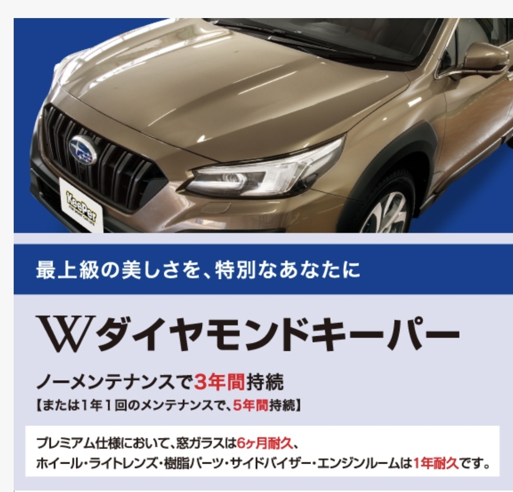 ⇒ダイヤモンドKeePerもしくは、ecoダイヤKeePerがおすすめ! 予算60,000円~ ダイヤモンドはノーメンテナンス※水洗い洗車のみで3年耐久となり、メンテナンスすると5年まで耐久となり、コーティングの回数が少なくする事ができます。