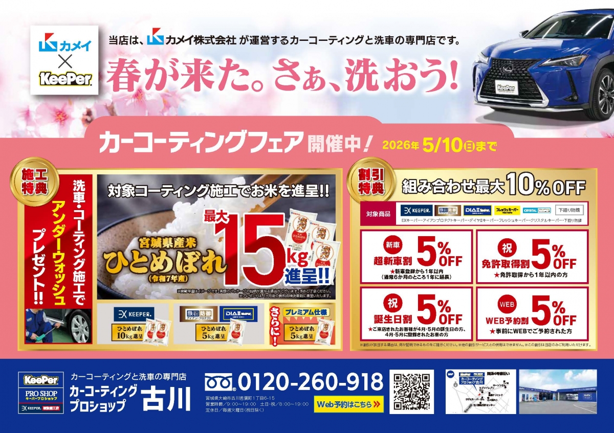 おはようございます!カーコーティングプロショップ古川でございます🥰本日快晴ですね☼✨しかし、昨日から強風が続いています💦運転の際は十分お気を付けくださいませ😭さて皆様、只今【春のカーコーティングフェア...