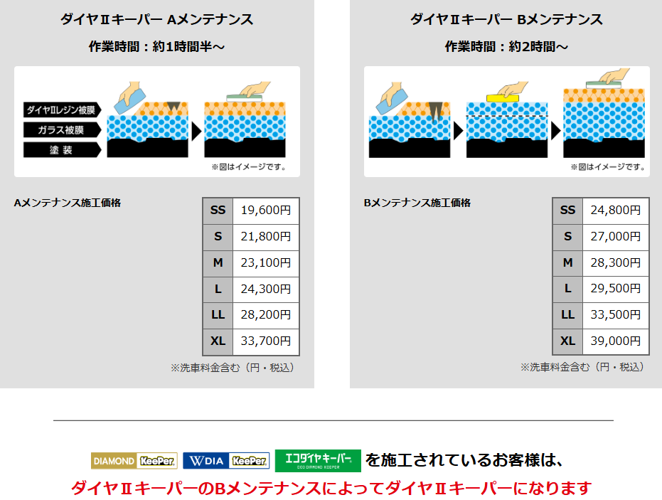 ピュアキーパーなら3ヶ月、クリスタルキーパーなら1年、ダイヤモンドキーパーまたはダブルダイヤキーパーなら3年、ノーWAX、ノーメンテナンスで、塗装をしっかり守り、本当のキレイさを維持することができます。あとは洗車だけで手間いらずの楽ちんなカーライフを実現!
