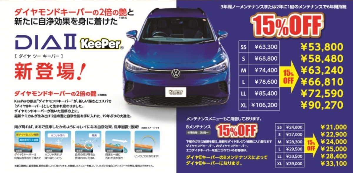 キーパーメニュー、予約選択可能メニューの中に当店では施工できないコーティングやオプションがございます。キャンセル頂く事が有るので、あらかじめご了承下さい