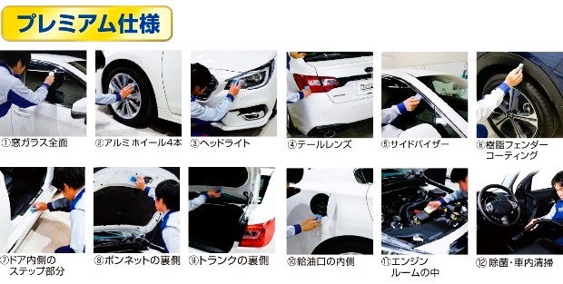 プレミアム仕様は、クルマのボディ以外も隅々まで美しさを保つよう、あらゆる箇所にもコーティング施工するサービスです。