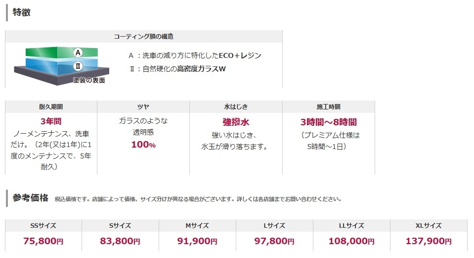 持続期間 : コーティング被膜の寿命は1年以上、ノーメンテナンス。使用状況により1〜2年の耐久力があります。