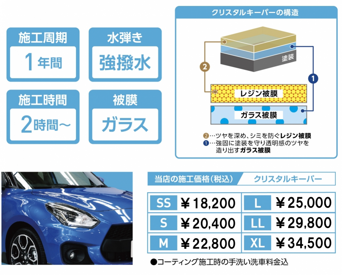 大ベストセラーコーティングのクリスタルキーパーにエコダイヤキーパーの防汚性能を加えた新しいコーティング。