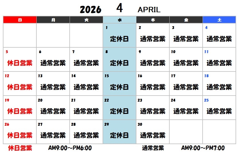 - 平日:AM9:00~PM7:00、日祝:AM9:00~PM6:00