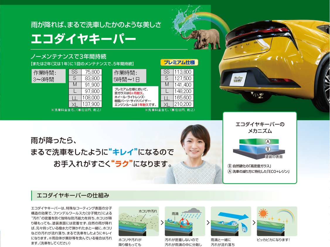 ただ水を弾くだけでなく防汚能力にも長けているので、少ない洗車回数でキレイを保ちたい方から ご自身で洗車をしたい方まで、幅広いお客様に人気のコーティングです!!