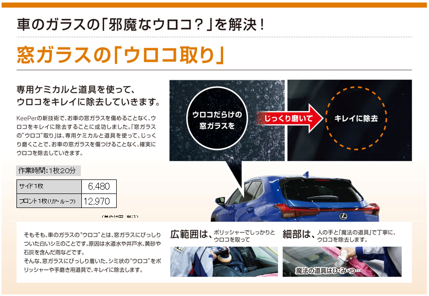 ガラスに付着した油膜やウロコを除去してからフッ素コーティングを施工することで、コーティングの定着も良くなり 強力な撥水効果で雨の日の視界をクリアに保ってくれます!