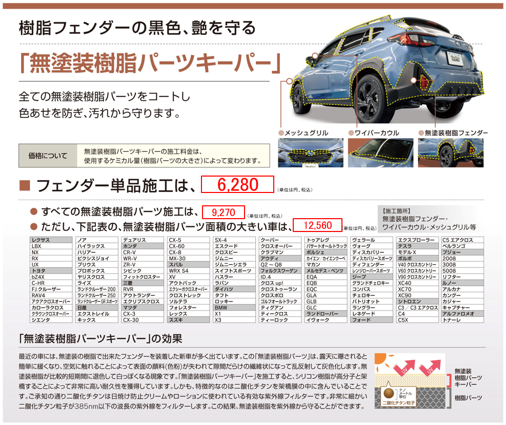 この樹脂フェンダーキーパーは最新のトレンド「無塗装樹脂フェンダー、樹脂バンパー」のしっとりとした質感を1年間守ります!