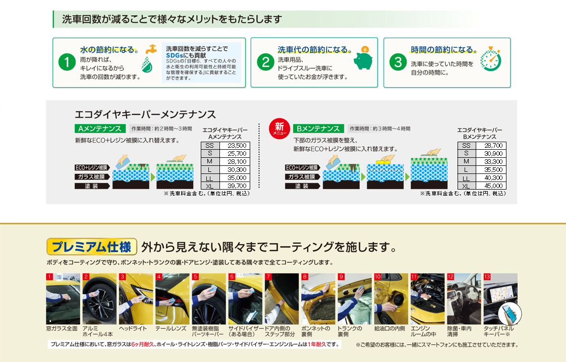 ●プレミアムメニューでのプラス部位はダイヤモンドキーパー、Wダイヤモンドキーパー、ECOプラスダイヤモンドキーパー全て共通で「①窓ガラス全面②ホイール4本③ヘッドライト④テールレンズ⑤サイドバイザー⑥樹脂フェンダーキーパー⑦ステップ部分⑧ボンネット裏⑨トランク裏⑩給油口内側⑪エンジンルーム⑫車内清掃」の全12点になります。