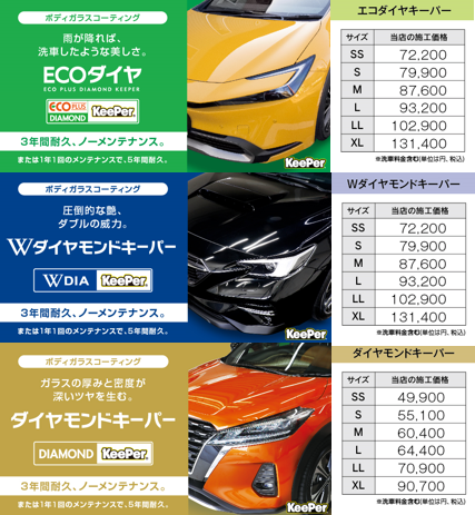 今までダイヤモンドキーパーを基準にさらなる輝きを求める方は「Wダイヤモンド」を、汚れにくさを追加したい方は「Ecoダイヤモンド」をお選び頂いていましたが、DIAⅡキーパーは両方の良い所取りで艶も汚れにくさも手に入れれます。しかもお手頃価格。「DIAⅡキーパー」おすすめです!