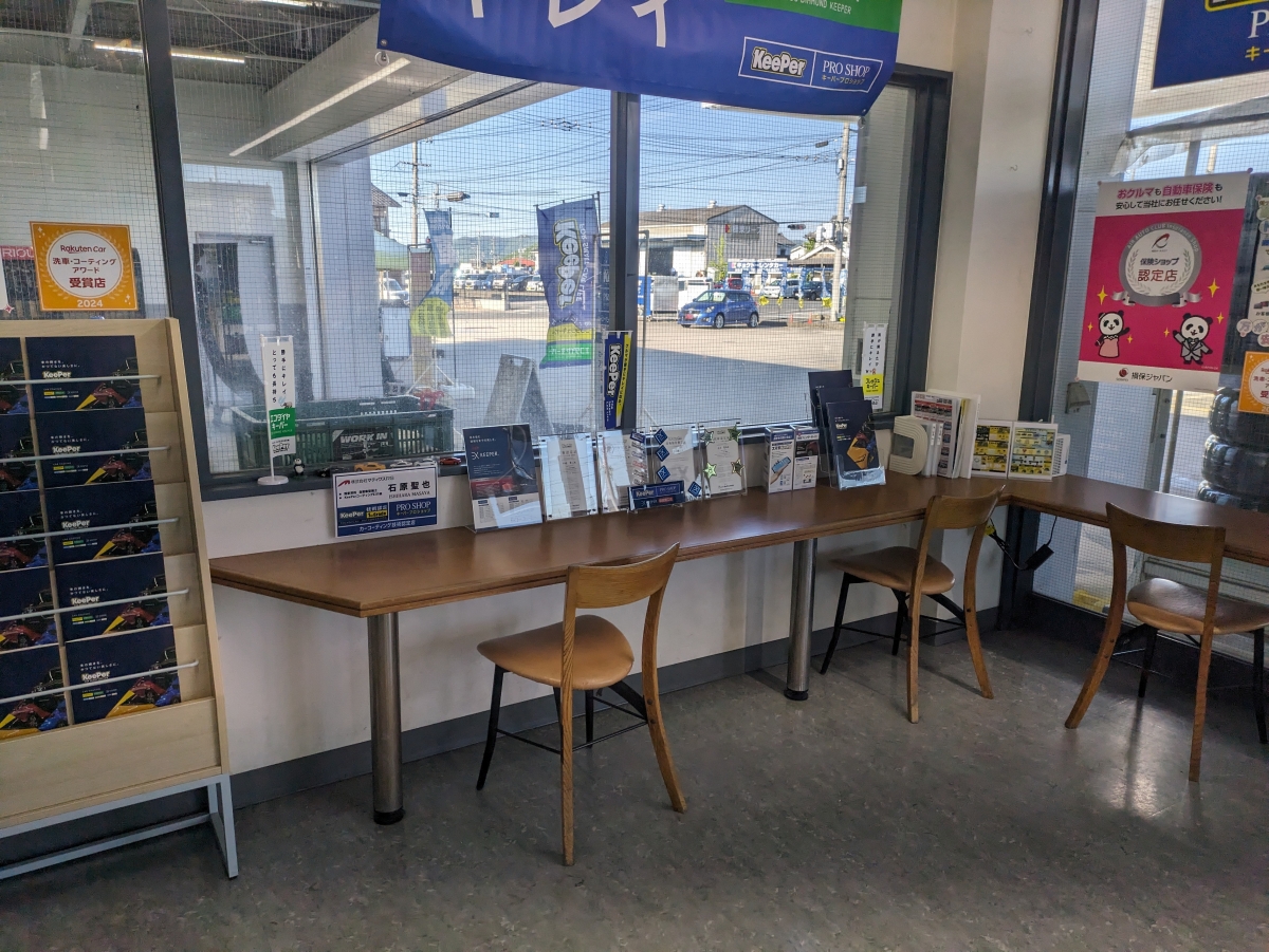 当店では手洗い洗車やコーティングの様子を空調のきいた待合室で見学できます。