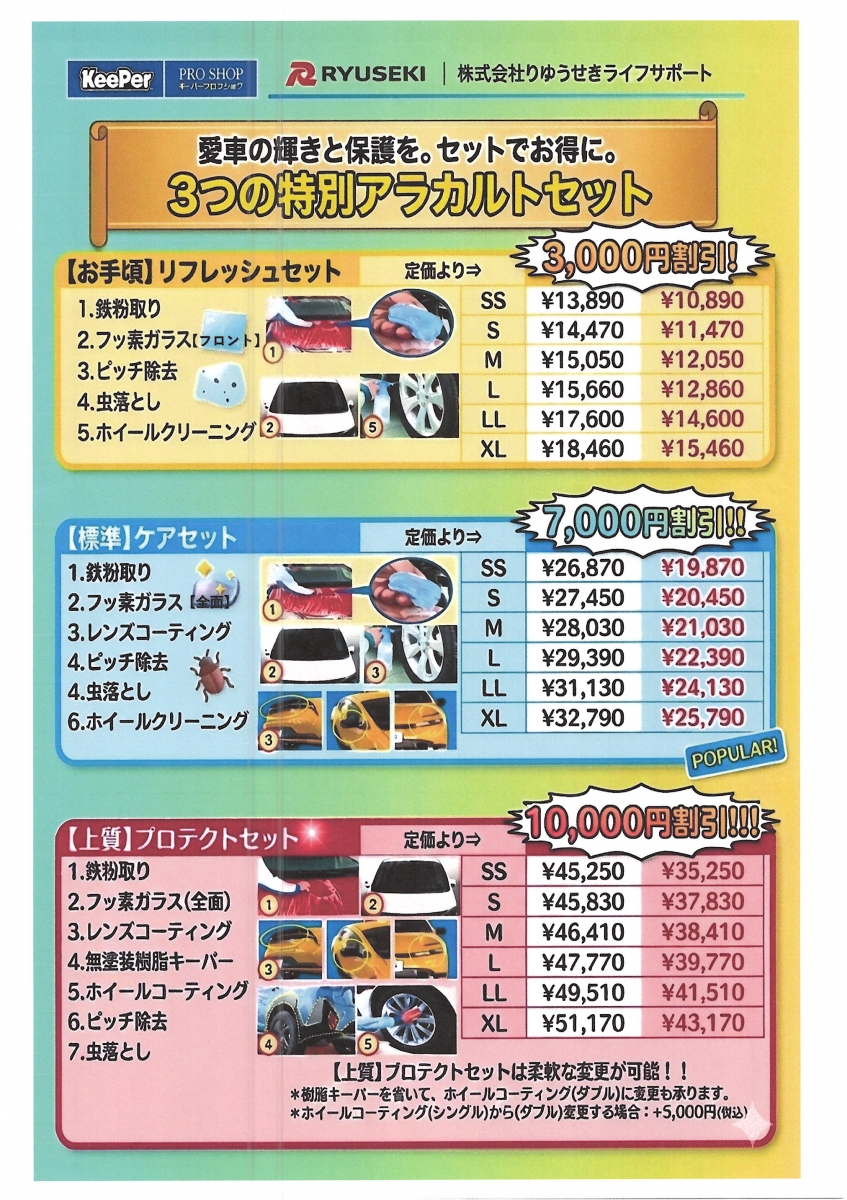 コーティングはボディだけじゃありません!窓ガラスコーティングやホイールコーティング等も施工出来るんです!ご予算に応じたお得なセットメニューを取り揃えていますのでボディコーティングにプラスして愛車をグレードアップさせちゃいましょう!
