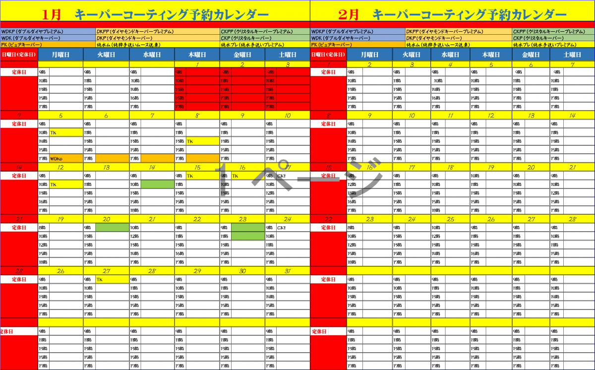 ★令和8年1月.2月のコーティング、洗車予定表★(1月9日9時00分現在) ・お客様のご都合に合う時間や日にちなど確認できますよ!コーティング、手洗い洗車、予約受付中!!いつでもお電話して下さい♪