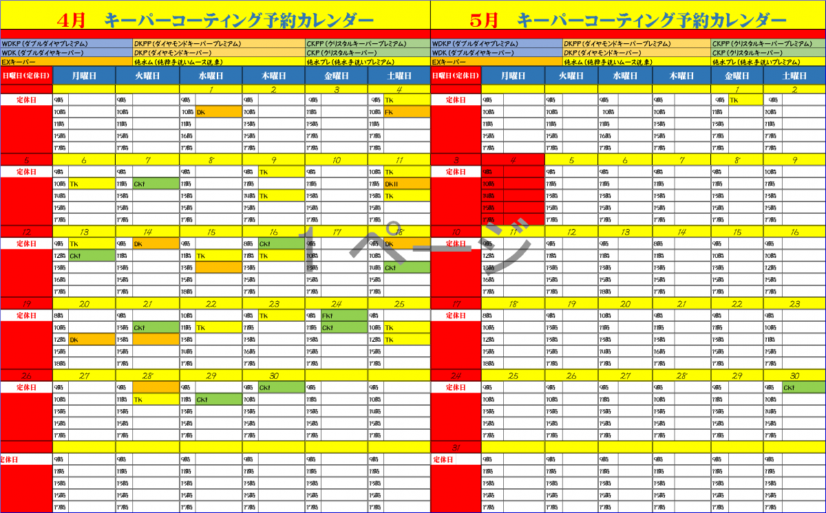 ★令和8年4月.5月のコーティング、洗車予定表★(4月28日9時00分現在) ・お客様のご都合に合う時間や日にちなど確認できますよ!コーティング、手洗い洗車、予約受付中!!いつでもお電話して下さい♪
